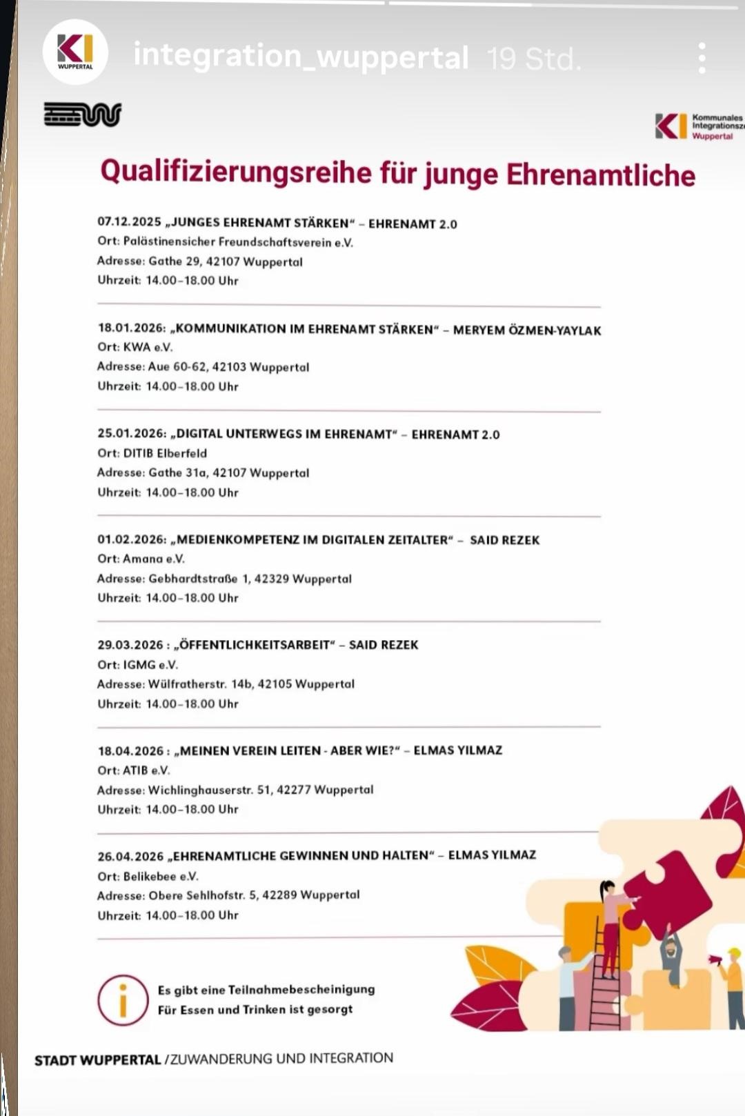 Ein weiterer Höhepunkt dieser Unterstützung ist das neuste Projekt des „Kommunalen Integrationszentrums Wuppertal.“ Sie veranstalten eine „Qualifizierungsreihe für junge Ehrenamtliche“, deren Workshops auch in den Räumlichkeiten von DITIB Elberfeld, der „Islamischen Gemeinschaft Milli Görüs e. V.“ (IGMG) und bei ATIB stattfinden (Siehe Sharepic)